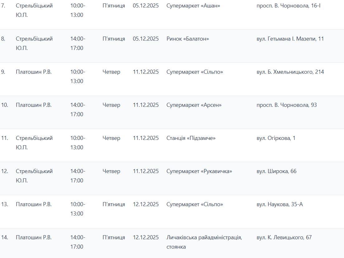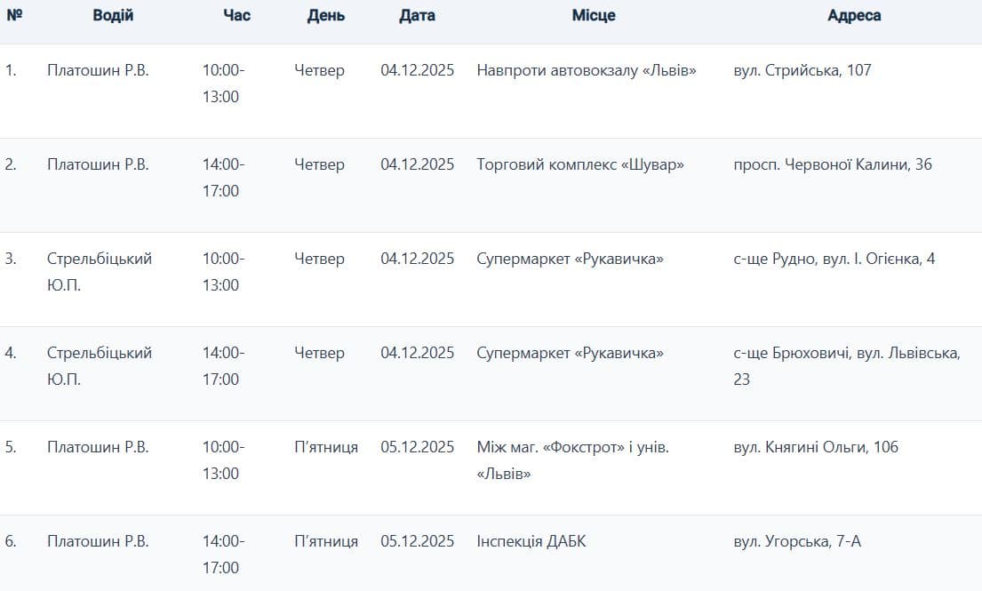 Екобус працюватиме у різних районах Львова, а також у Винниках, Брюховичах та Рудному з 4 по 20 грудня. На кожній локації він перебуватиме протягом трьох годин у проміжках з 10:00 до 13:00 або з 14:00 до 17:00.