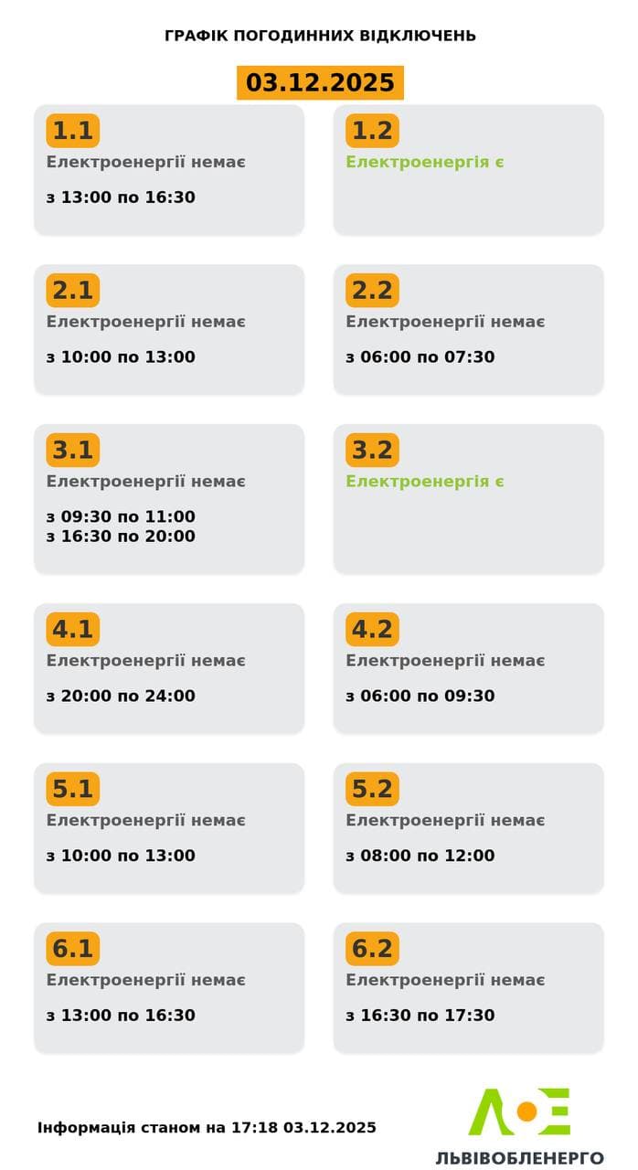 У Львові о 17:18 оновили графіки відключення світла на 3 грудня. Про це повідомили у «Львівобленерго».