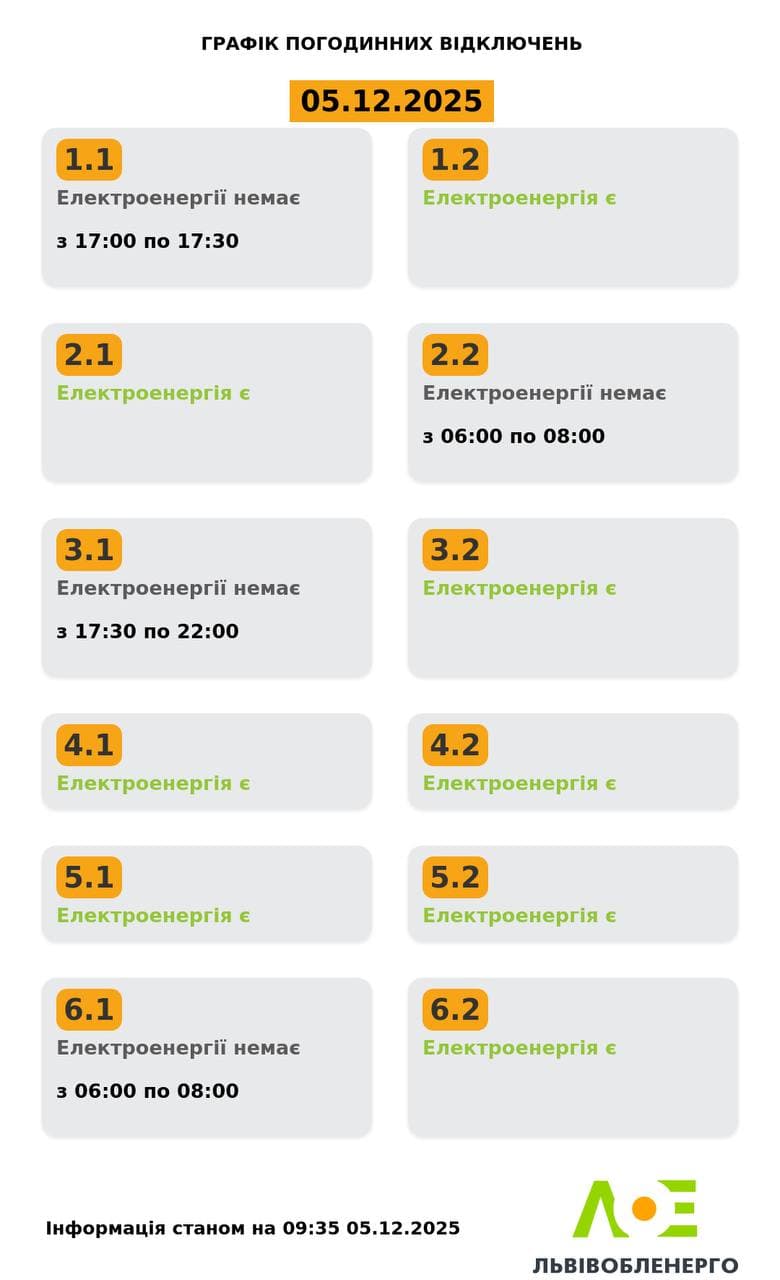 У Львові о 9:35 оновили графіки відключення світла на 5 грудня. Про це повідомили у «Львівобленерго».