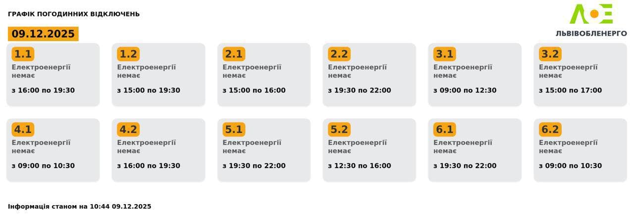Сьогодні, 9 грудня, на Львівщині діятимуть графіки погодинних відключень електроенергії. Про це повідомили у «Львівобленерго».