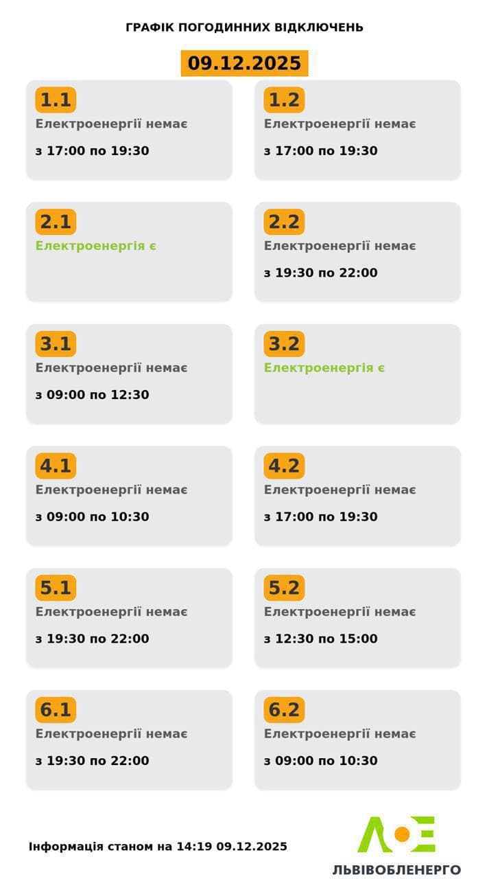 У Львові о 14:19 оновили графіки відключення світла на 9 грудня. Про це повідомили у «Львівобленерго».