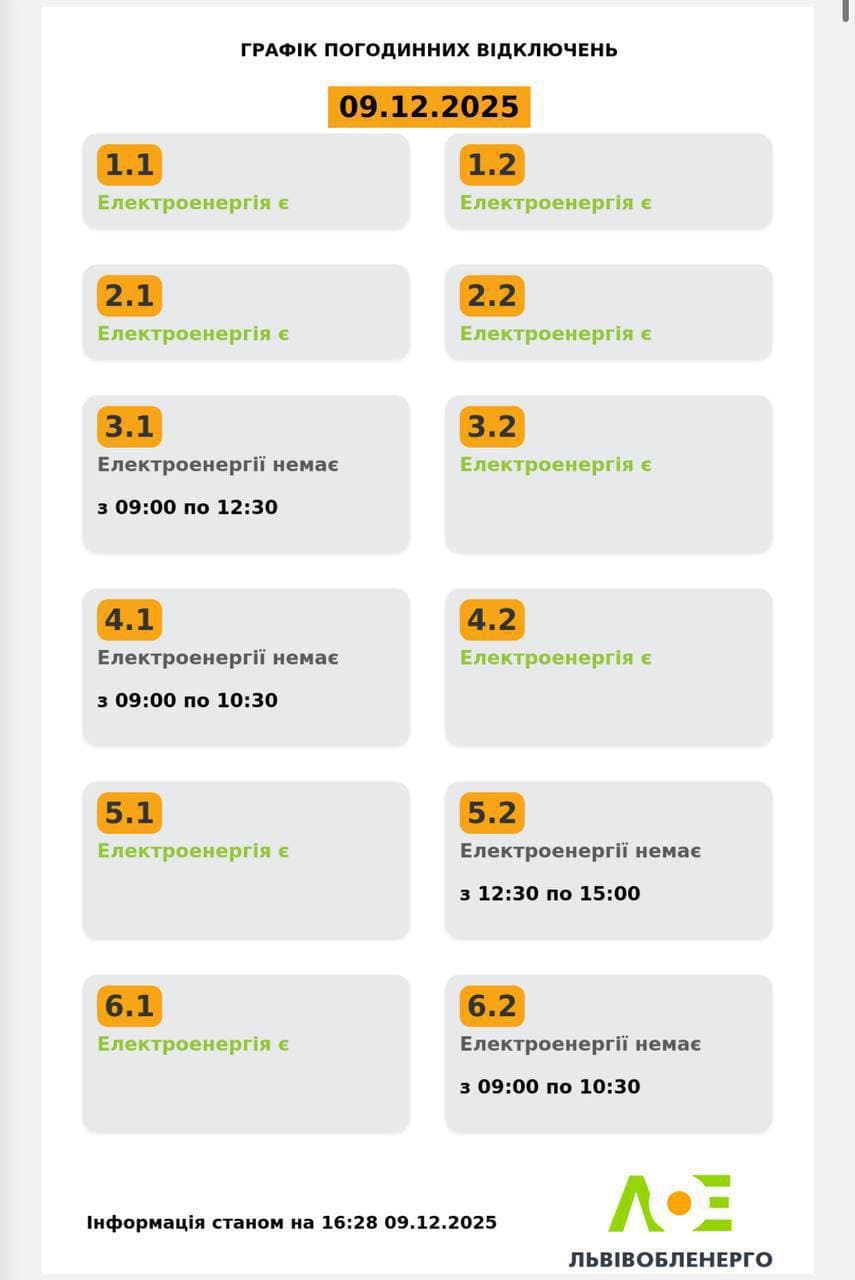 У Львові о 16:28 оновили графіки відключення світла на 9 грудня. Про це повідомили у «Львівобленерго».