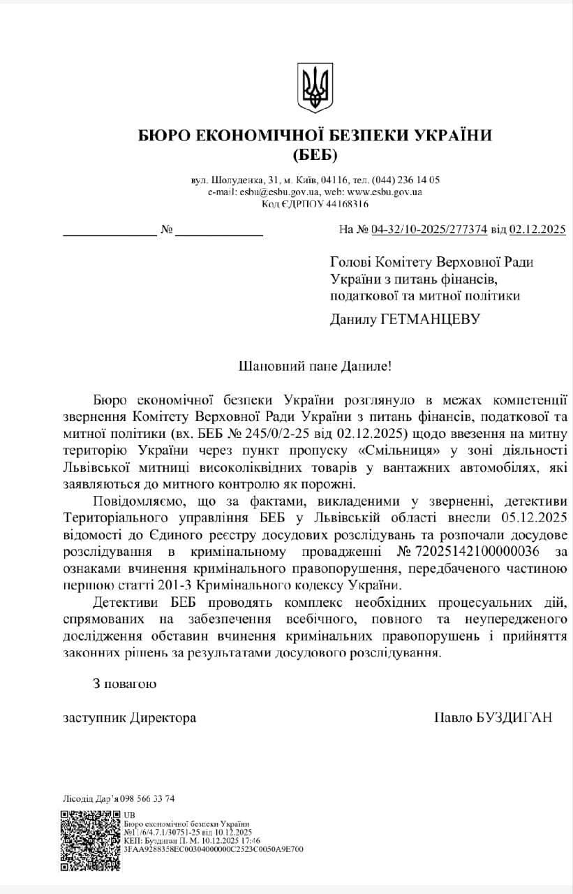 У своєму телеграм-каналі Данило Гетьманцев, голова комітету з питань фінансів, податкової та митної політики України, повідомив, що звертався до БЕБ з проханням перевірити пункт пропуску «Смільниця» через можливу контрабанду.