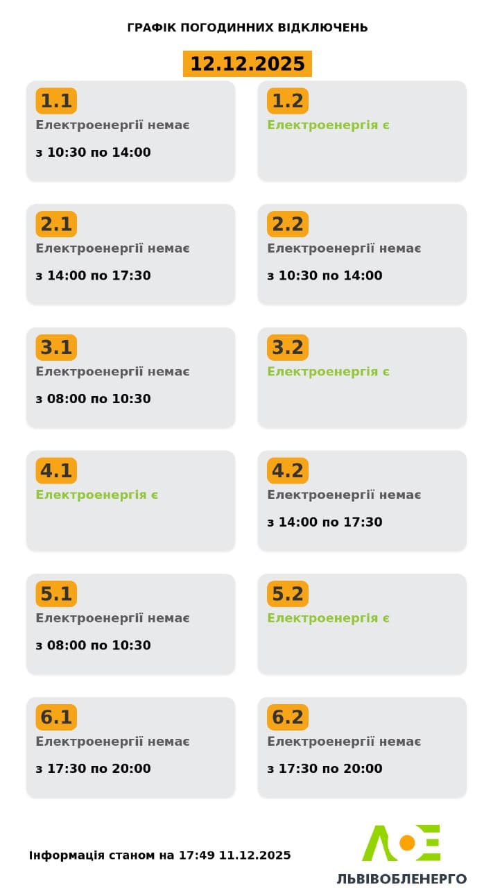 У Львові оприлюднили графіки відключень світла на п'ятницю, 12 грудня. Про це повідомляє «Львівобленерго.