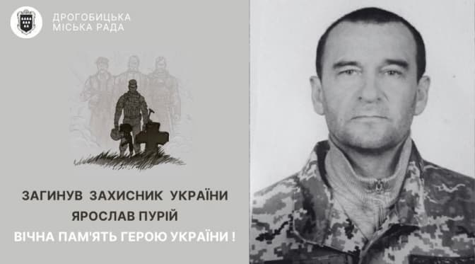 На війні загинув захисник України – дрогобичанин Ярослав Пурій, який шість з половиною років життя присвятив захисту рідної країни від ворога – в час АТО та під час повномасштабного вторгнення ворога. Про це повідомила пресслужба Дрогобицької міської ради.