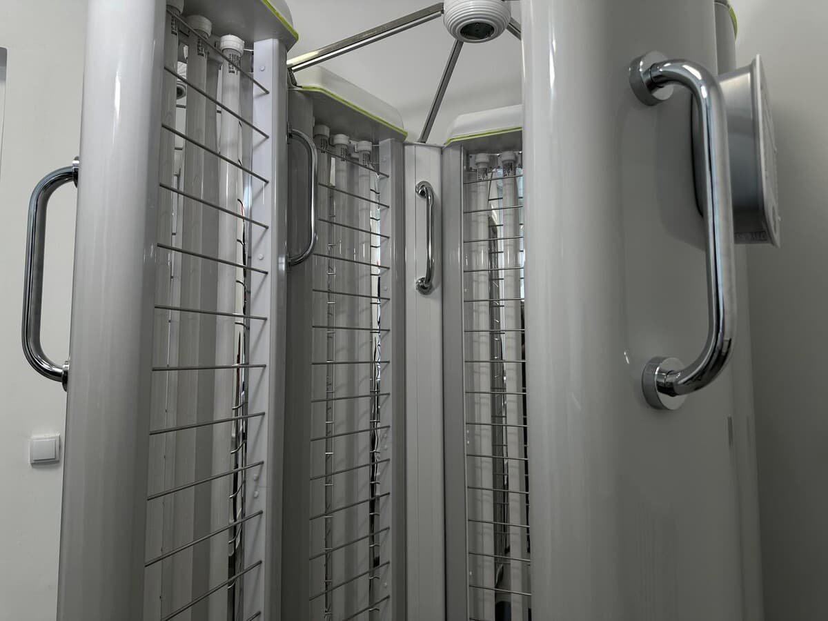 Перед кожною процедурою обладнання проходить тестування. Пацієнт заходить у спеціальну кабіну в захисних окулярах. Кабіна складається з п’яти секцій, має захисні решітки та унеможливлює контакт із лампами.