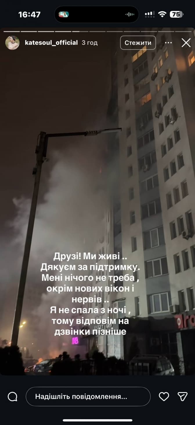За словами артистки, ударний дрон влучив у поверхи над її квартирою. Внаслідок вибуху в помешканні Kate Soul, яке розташоване на дев’ятому поверсі, вибило всі вікна, а всередині залишилося багато уламків скла. Відео та фото з наслідками обстрілу вона опублікувала в сториз.
