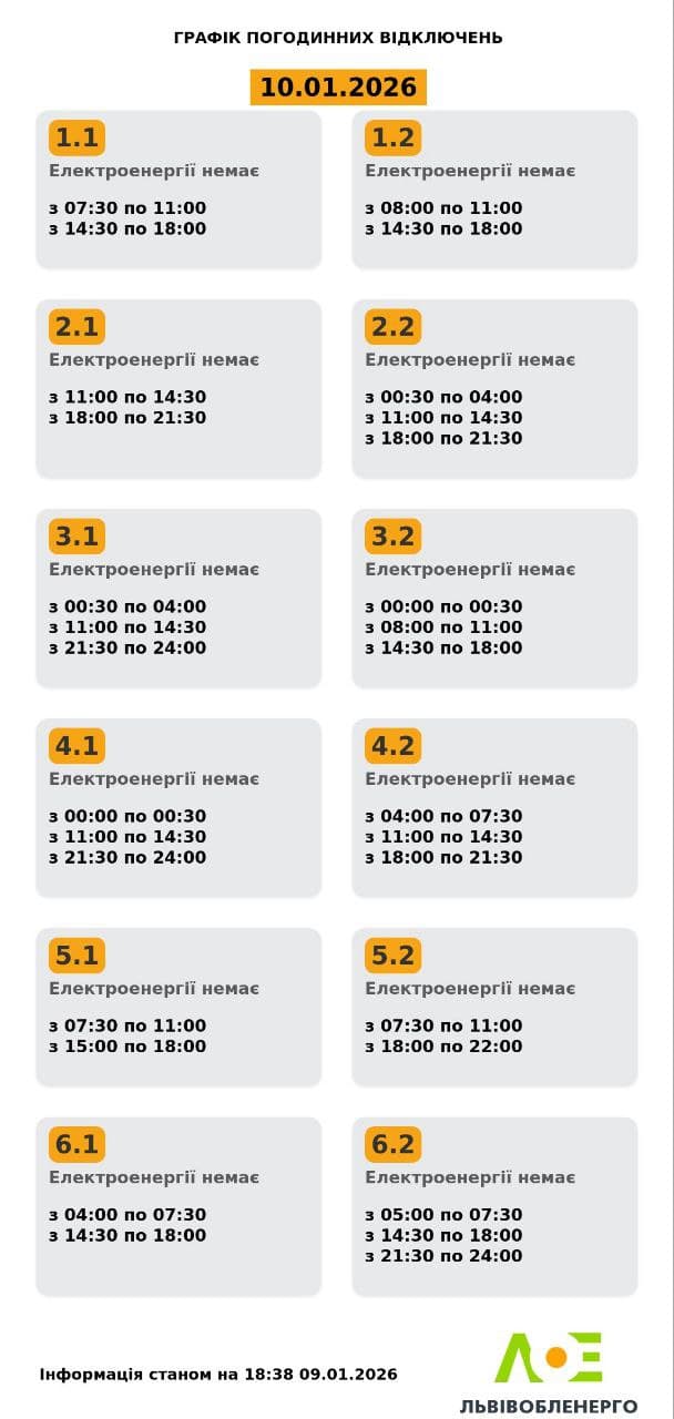 «Львівобленерго» опублікував графіки відключень світла на суботу, 10 січня.