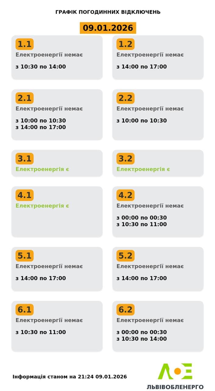 «Львівобленерго» вчергове оновило графіки відключення світла на Львівщині на 9 січня.