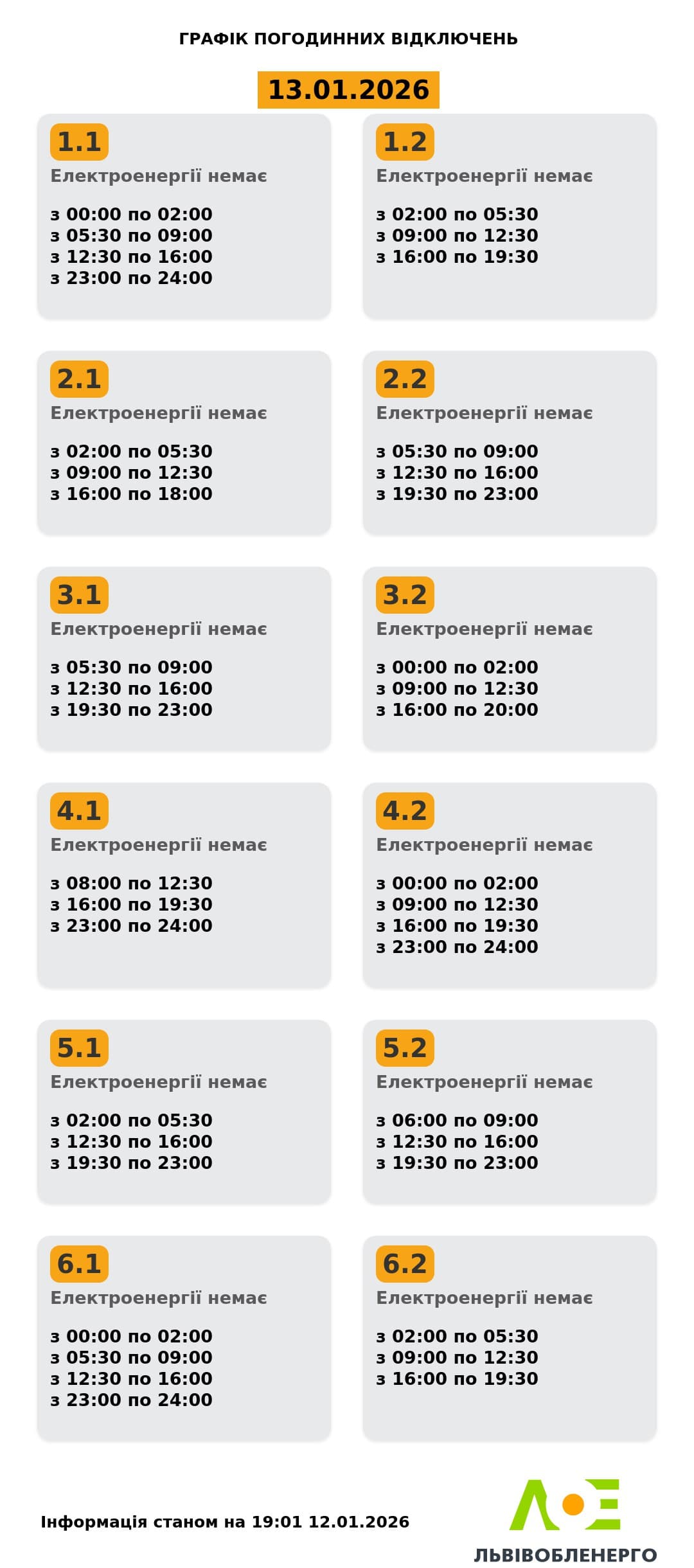 «Львівобленерго» опублікувало графіки вимкнень світла на вівторок, 13 січня.