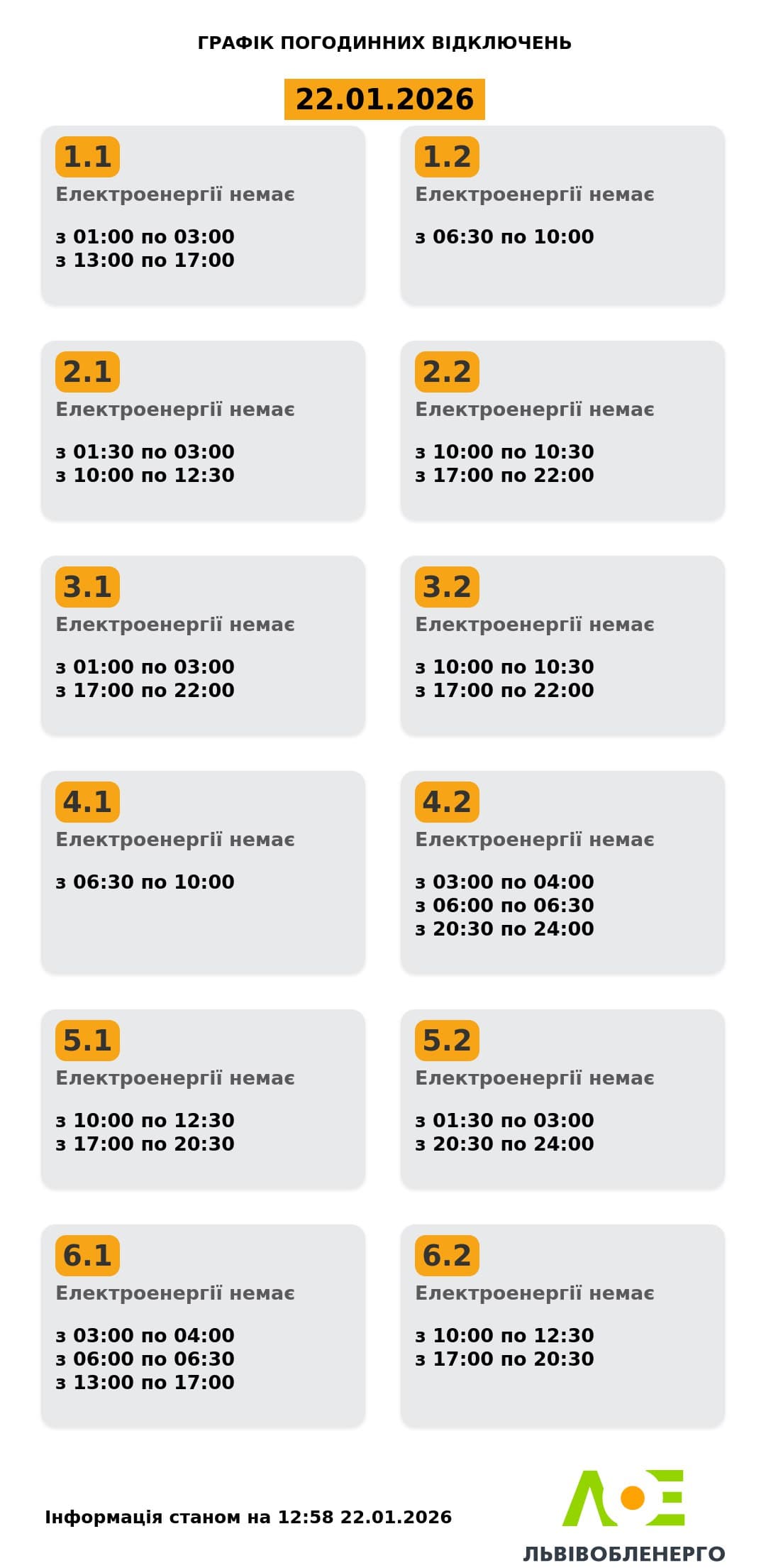 «Львівобленерго» оновило графіки відключень світла на четвер, 22 січня.