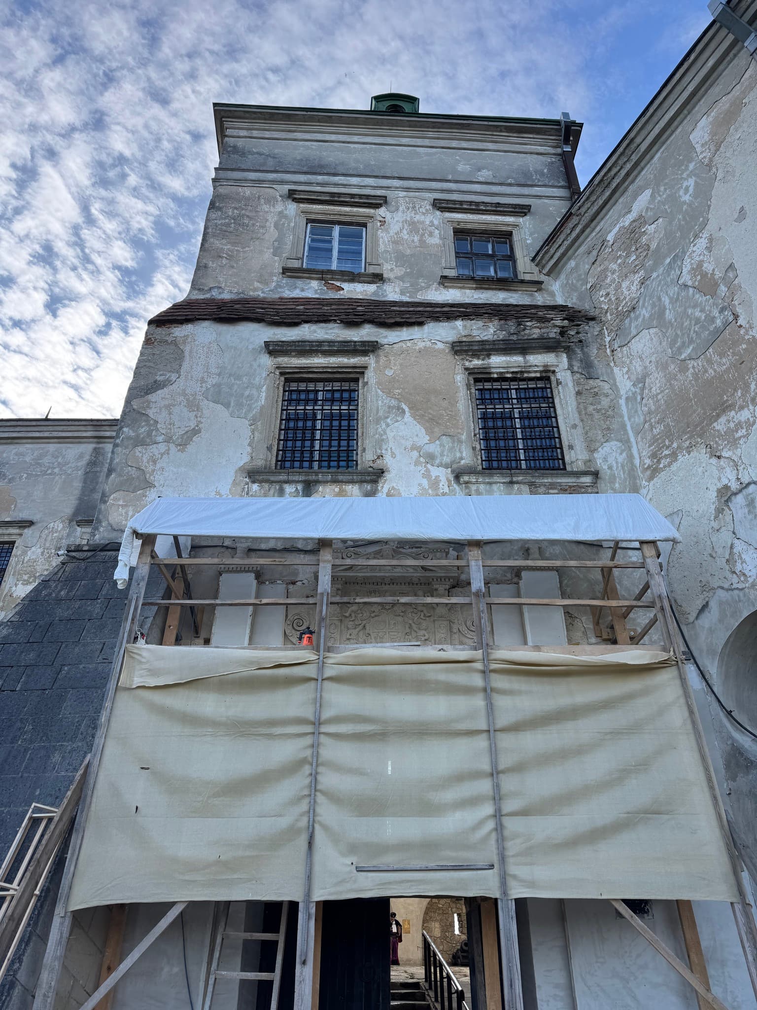 Обсяг робіт передбачає консервацію кам’яних віконних елементів, штукатурки та покрівлі верхнього поверху переднього фасаду, а також кам’яної частини під’їзду до брами.