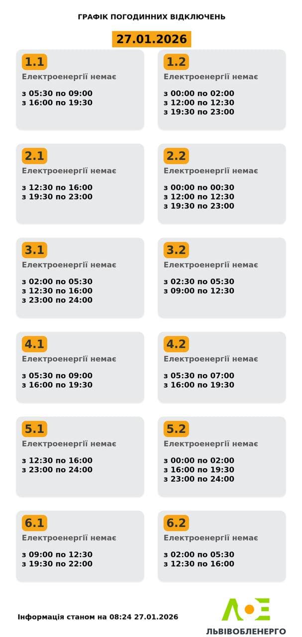 Львівобленерго опублікувало оновлені графіки відключень світла на 27 січня.