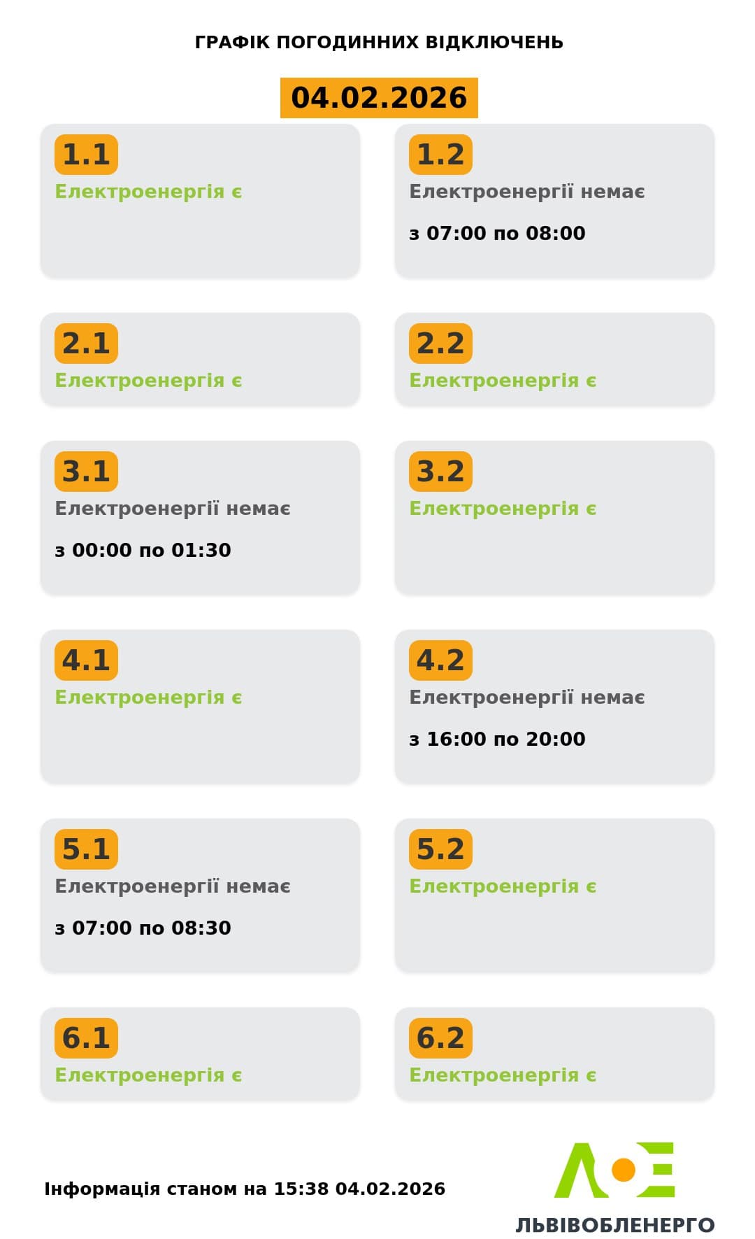 Львівобленерго знову оновило графіки відключень світла на 4 лютого.