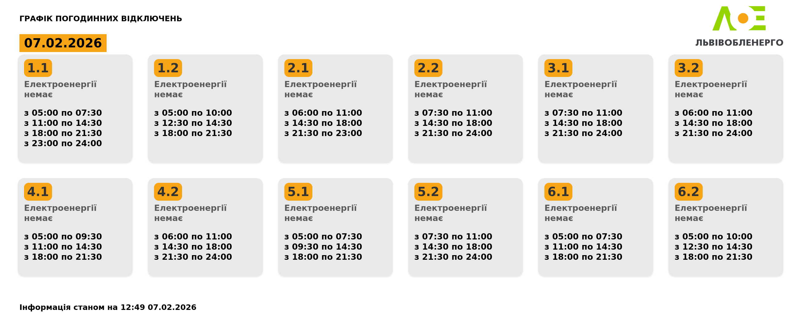 Львівобленерго опублікувало оновлені графіки відключень світла на 7 лютого.
