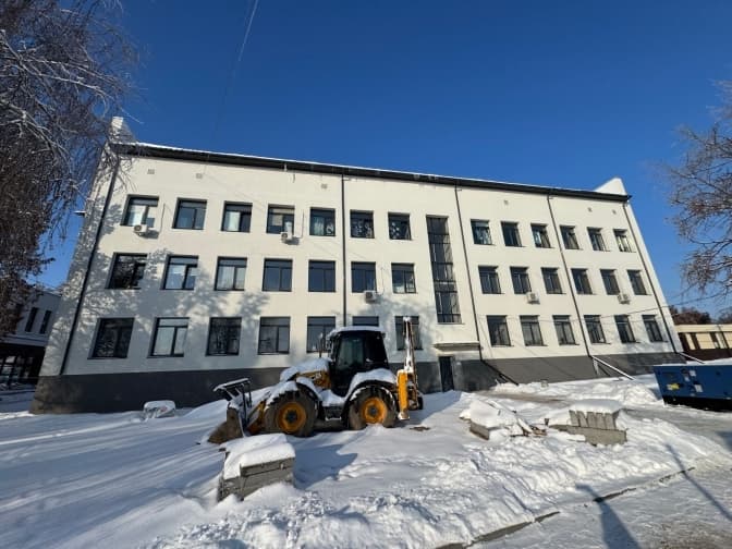 Паралельно проводять благоустрій прилеглої території. Після значних руйнувань триповерхову будівлю майже повністю відновили: оновили покрівлю, замінили вікна та двері, виконали фасадні роботи й утеплення цоколю. Системи водопостачання, каналізації, електромережі, освітлення та санвузли готові на 95%.