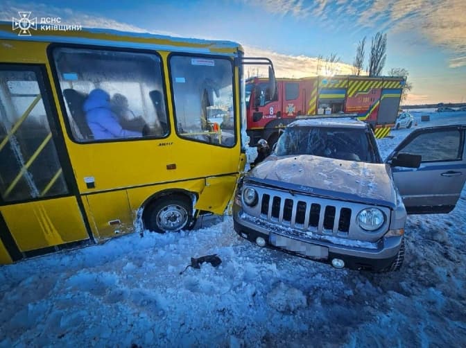 Дорожньо-транспортна пригода сталася 19 лютого о 07:53 у селищі Ставище Білоцерківського району. На місці події рятувальники встановили, що зіткнулися легковий автомобіль Jeep та шкільний автобус.