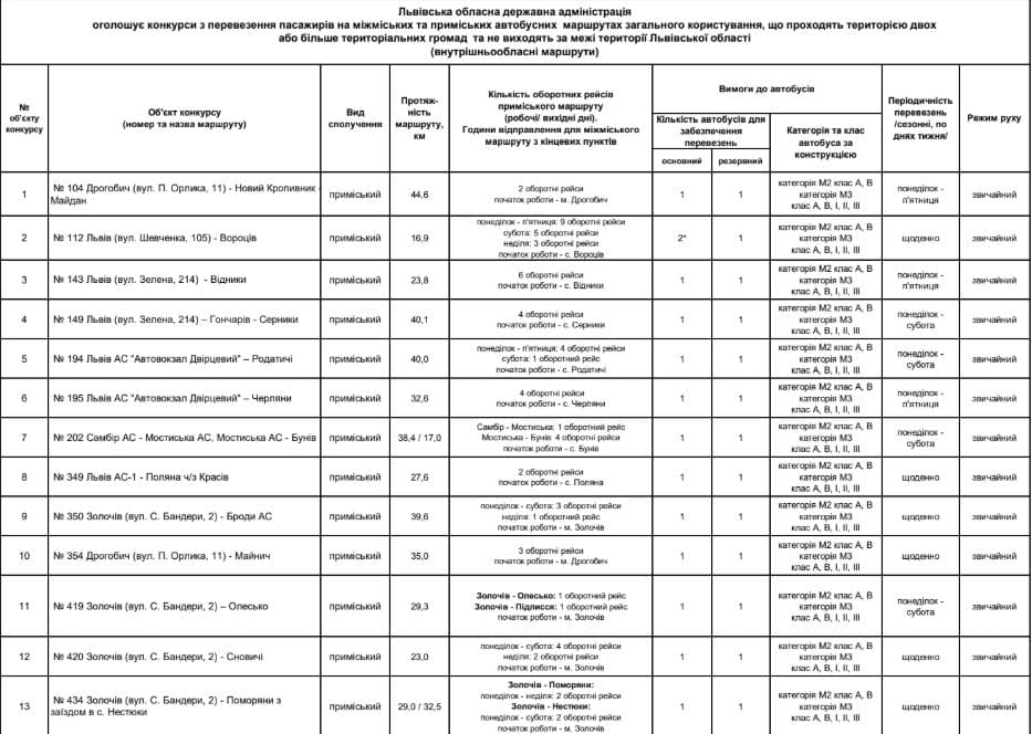 Він зазначив, що конкурс відбудеться 26 березня 2026 року. Документи приймають до 10 березня включно в управлінні транспорту департаменту дорожнього господарства Львівської ОДА. Наразі на розгляд винесено 42 об’єкти конкурсу: 15 приміських маршрутів та 27 міжміських маршрутів або окремих графіків міжміських маршрутів.