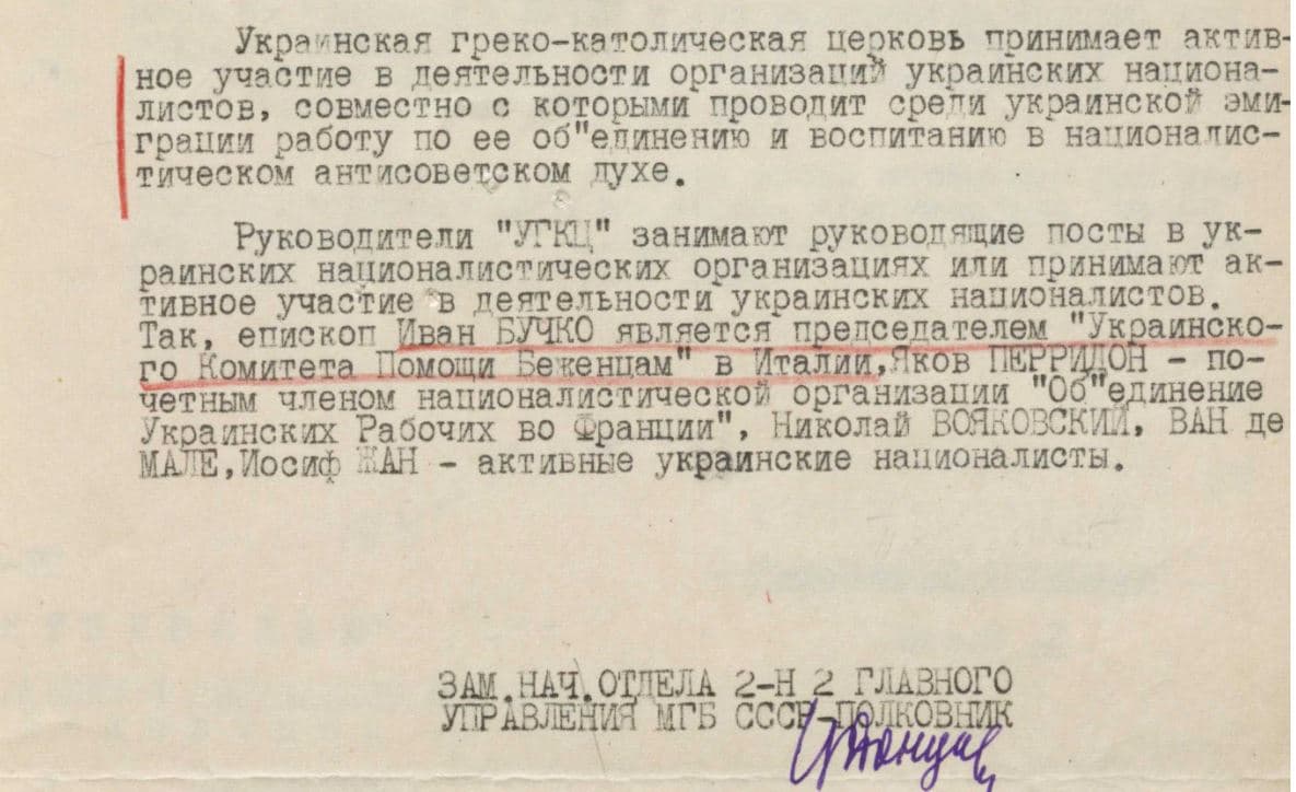 Окремий масив розсекречених справ стосується архієпископа Івана Бучка, якого радянська розвідка вважала одним із найнебезпечніших центрів впливу за кордоном. Через його прямий доступ до Папи Римського та активну підтримку української діаспори КДБ роками здійснювало за ним стеження в Європі, намагаючись зібрати дані про його контакти. Справу на Бучка закрили лише через неможливість продовжувати оперативну розробку на території Італії, передавши всі матеріали до Москви.