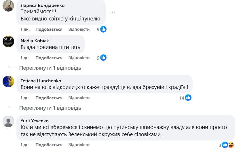У коментарях підписники громадської діячки або активно підтримують її і зазначають, що «Влада повинна піти геть», або підкреслюють, що її діяльність грає на руку ворогові і приносить лише шкоду українському суспільству.