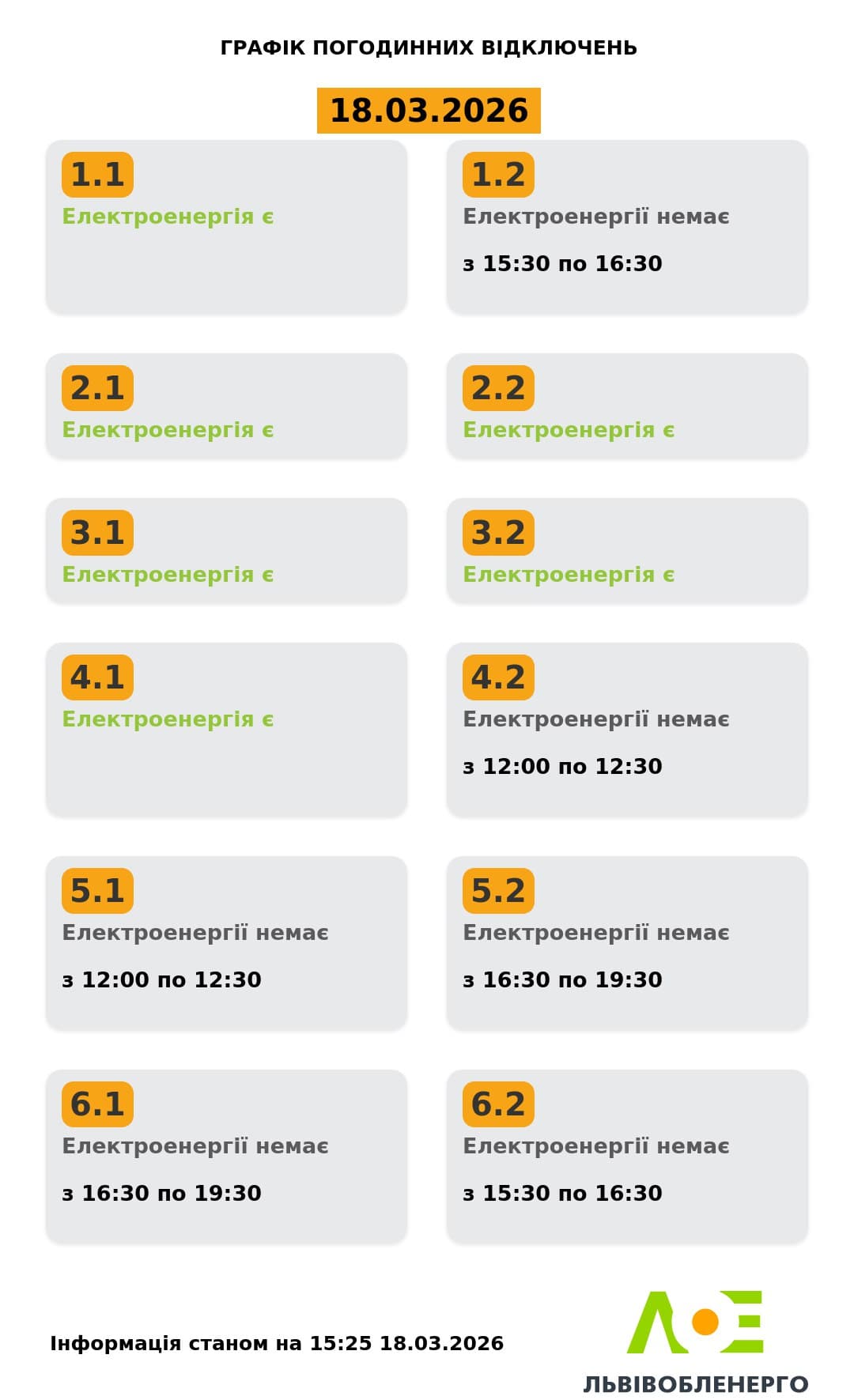 на сайті «Львівобленерго» у розділі «Чому немає світла»: https://poweron.loe.lviv.ua/