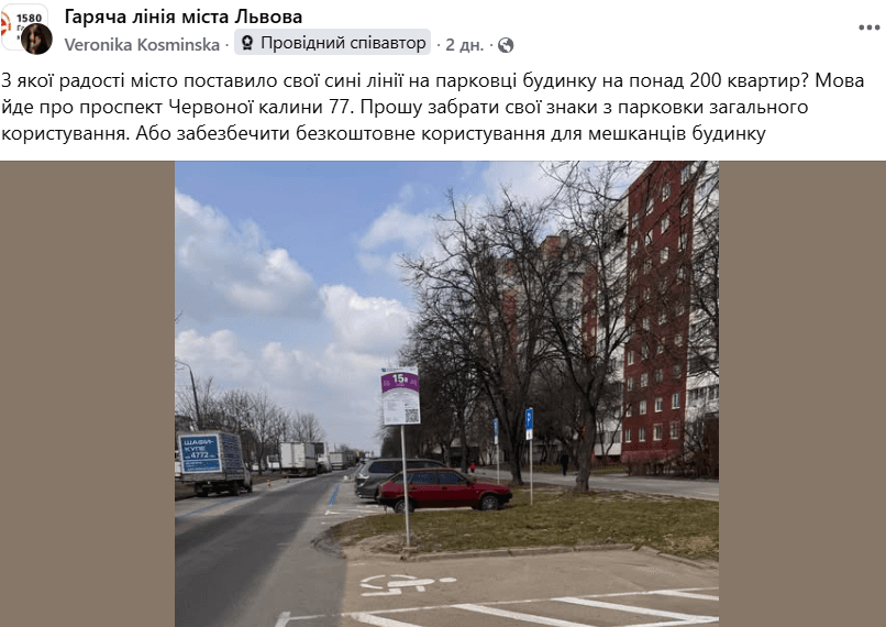«З якої радості місто поставило свої сині лінії на парковці будинку на понад 200 квартир? Прошу забрати знаки або забезпечити безкоштовне користування для мешканців», – написала на «гарячій лінії» одна з мешканок багатоповерхівки.