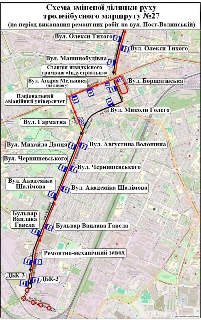 Тролейбус № 27 у цей час курсуватиме лише від станції метро «Почайна» до зупинки «ДБК-3». Транспортники просять киян заздалегідь планувати свої поїздки, враховуючи ці корективи та обираючи альтернативні шляхи пересування районом.