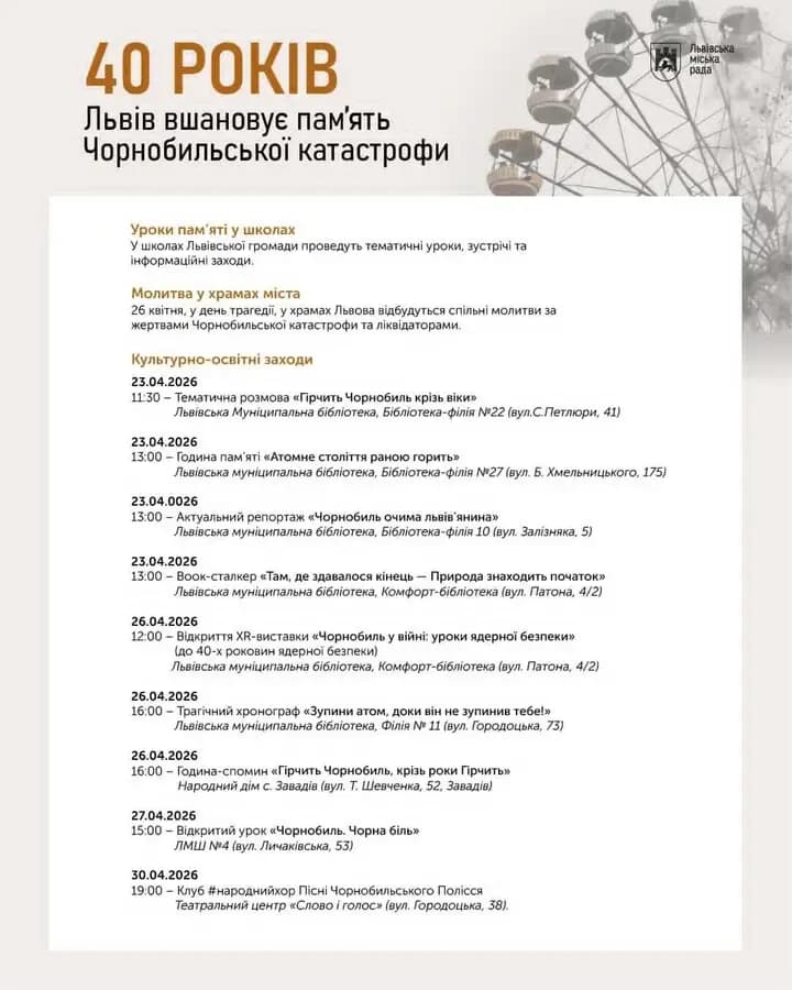 Міські заклади культури підготували низку тематичних подій упродовж кількох днів — від 23 до 30 квітня у різних локаціях Львова (нижче подаємо події 26-30 квітня). Зокрема, у бібліотеках міста відбудуться години пам’яті, тематичні розмови, відкриті уроки та інтерактивні заходи, які допоможуть осмислити трагедію Чорнобиля через особисті історії та сучасний контекст.