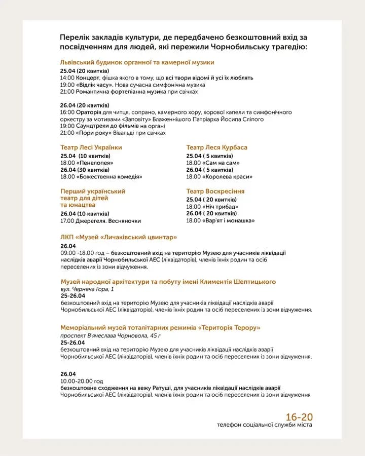 Безкоштовний вхід для учасників ліквідації наслідків аварії Чорнобильської АЕС (ліквідаторів), членів їхніх родин та осіб переселених із зони відчуження буде доступний у таких установах: