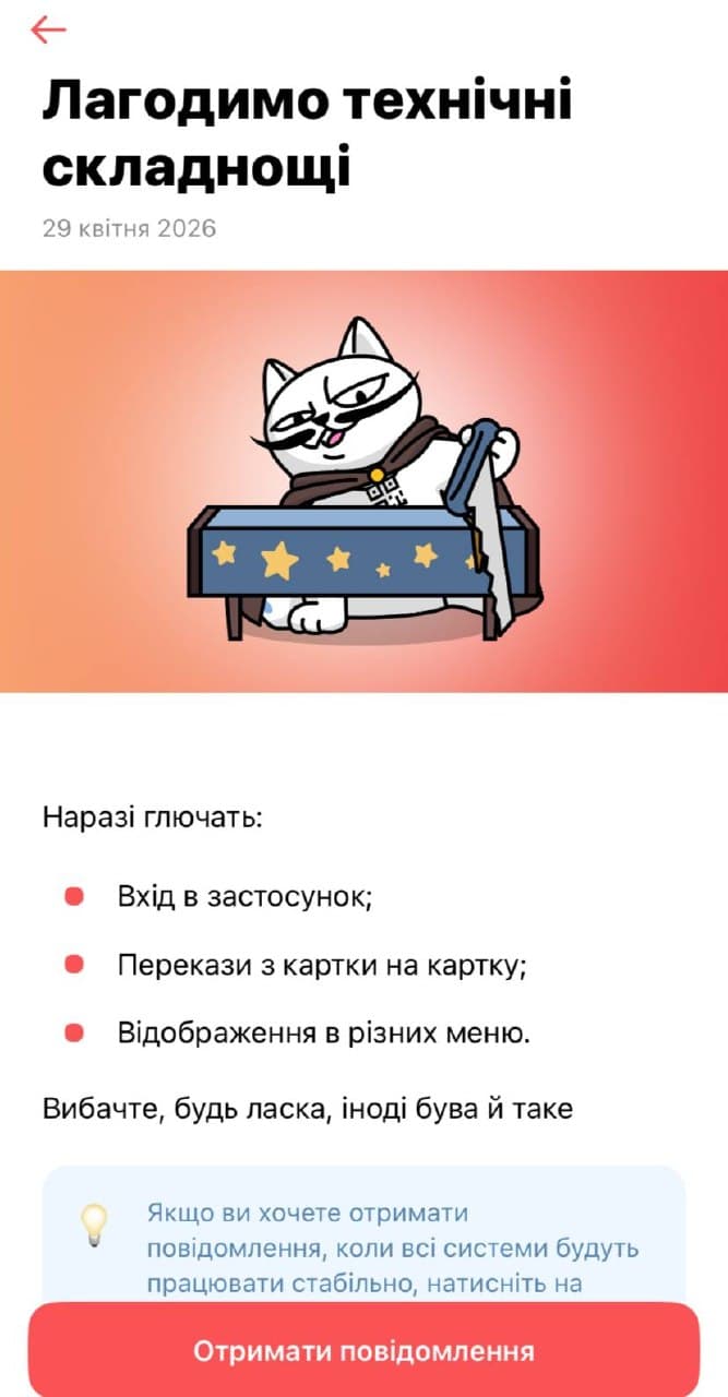 Застосунок не завантажується, а також недоступні грошові перекази та інші функції банку.