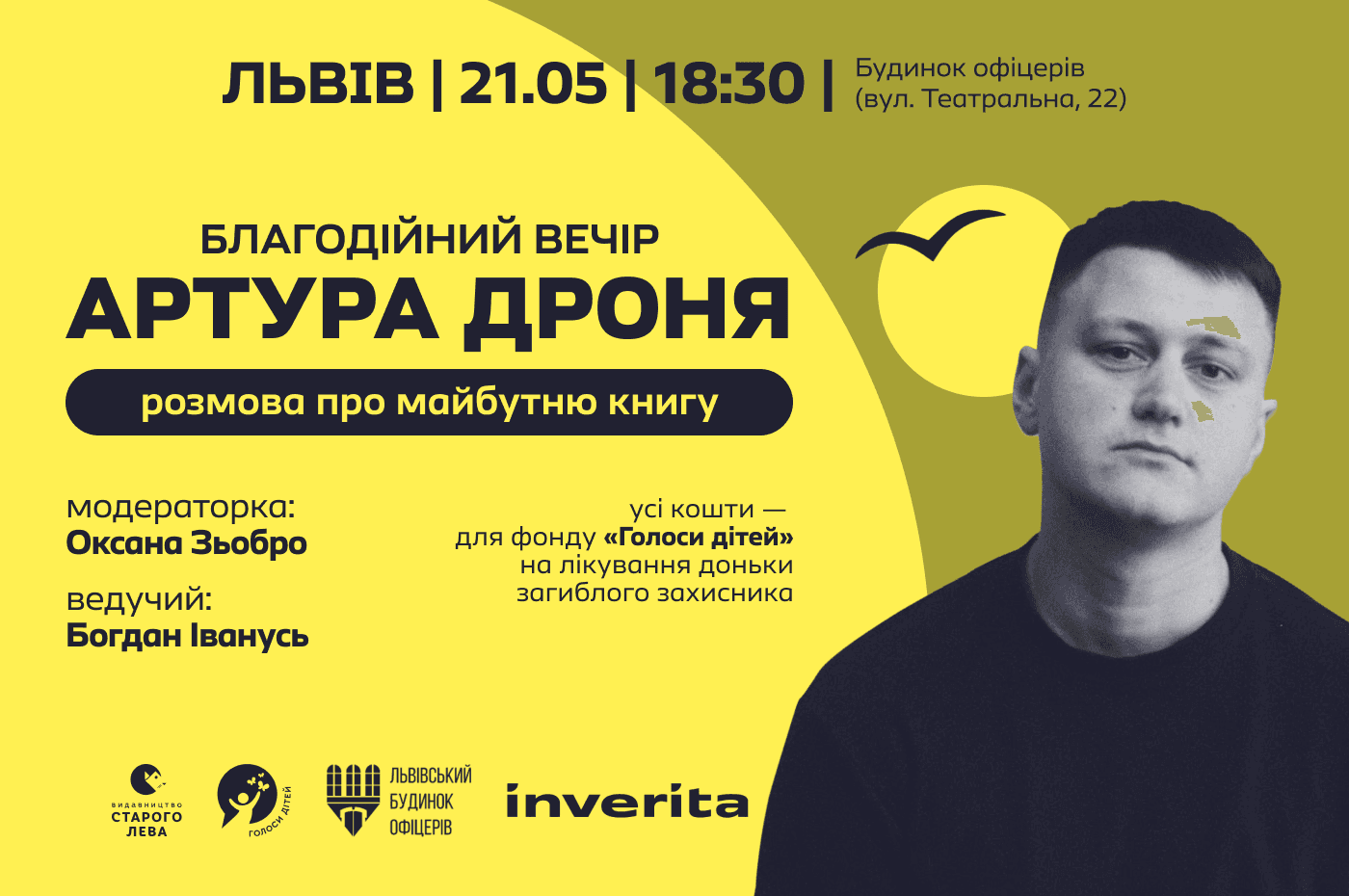 У четвер, 21 травня, о 18:30 у Львові в Будинку офіцерів (вул. Театральна, 22) відбудеться благодійний літературний вечір письменника і ветерана російсько-української війни Артура Дроня. Темою вечора стане нова книга автора, а всі виручені кошти передадуть на лікування доньки загиблого захисника. Про це йдеться у релізі "Видавництва старого Лева".