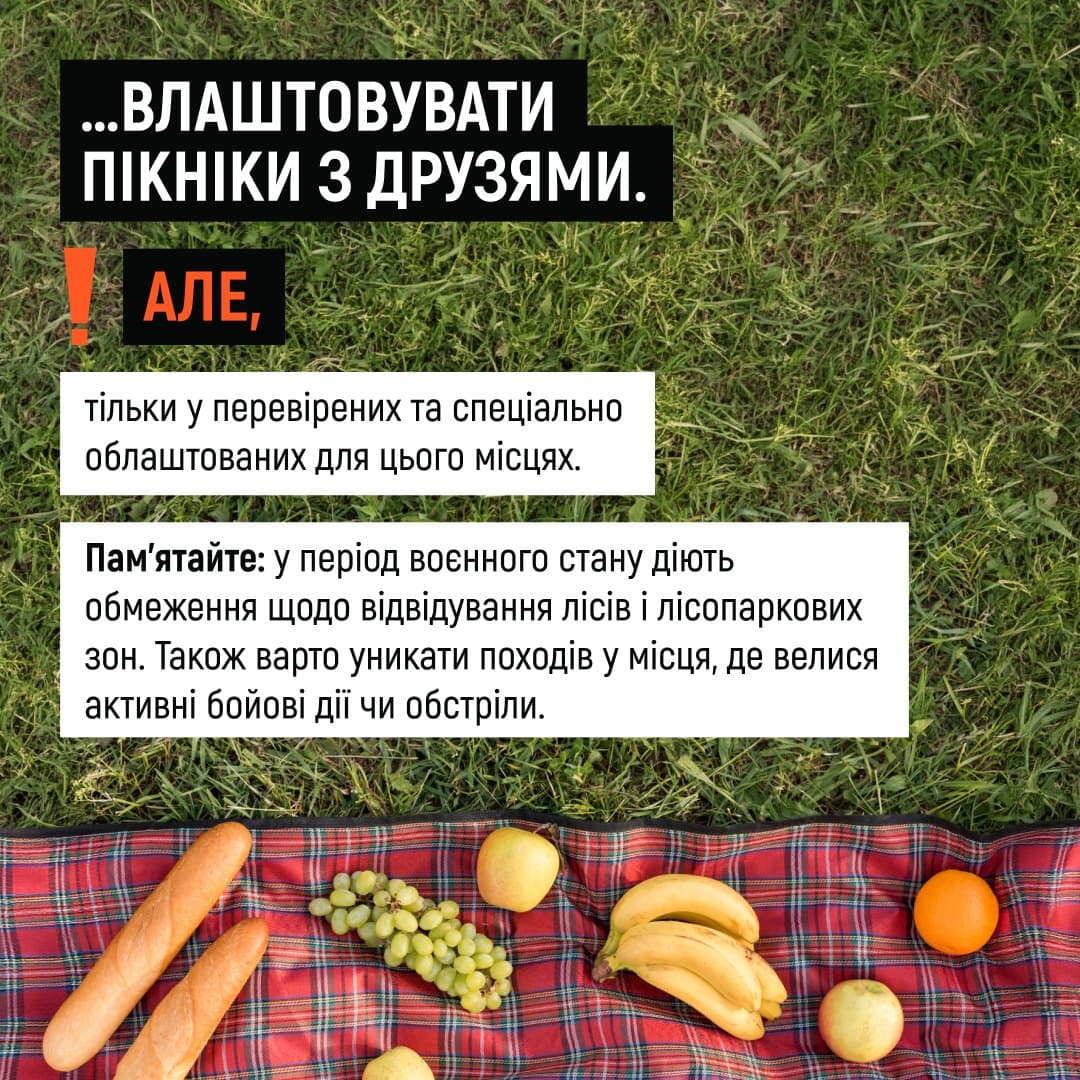 Також варто враховувати, що в періоди високої пожежної небезпеки можуть діяти обмеження на відвідування лісів. Окрім цього, через воєнний стан необхідно зважати на комендантську годину.