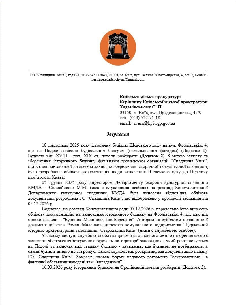 На київському Подолі розгорівся конфлікт навколо будівлі XIX століття на вулиці Фролівскій, 4. Активісти на чолі з Дмитром Перовим заявляють про «демонтаж», адміністрація ДІАЗ та реставратори запевняють, що триває порятунок споруди від аварійних радянських нашарувань.