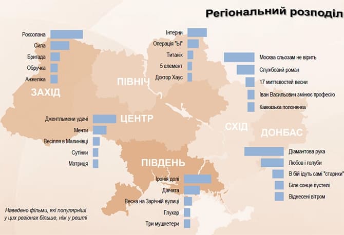 Мешканці Сходу частіше інших обирали такі фільми як «Москва сльозам не вірить», «Службовий роман», «17 миттєвостей весни». Натомість на Донбасі дивляться «Діамантову руку», «Любов і голуби» та «В бій ідуть самі «старики». У Південному регіоні люблять такі стрічки як «Іронія долі», «Дівчата», «Весна на Зарічній вулиці», «Три мушкетери» та серіал «Глухар».