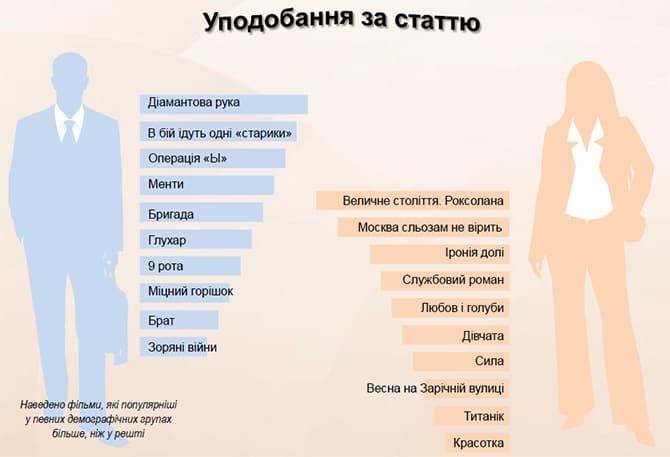 Жінки обирають мелодрами, а також комедії: «Москва сльозам не вірить», «Іронія долі», «Службовий роман», «Любов і голуби», а також серіали «Величне століття. Роксолана» та «Сила».
