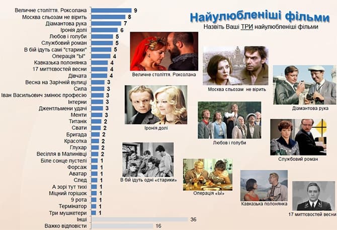 До найулюбленіших фільмів українців увійшли також «Величне століття. Роксолана» (9%), «Москва сльозам не вірить» (8%), «Діамантова рука» (7%), «Іронія долі або з легким паром» (6%).