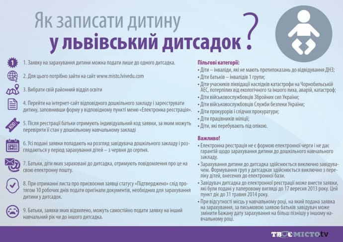 Щоб зареєструвати в чергу дитину, потрібно перейти за посиланням www.misto.lvivedu.com, далі вибрати свій районний відділ освіти, перейти на інтернет-сайт відповідного дошкільного закладу і зареєструвати дитину, заповнивши форму у відповідному пункті меню «Електронна реєстрація».