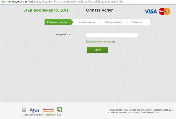 Для оплати он-лайн за спожиту електроенергію використовуються банківські картки VISA та MasterCard.