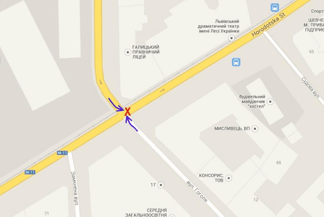 1. Перехрестя вулиць Городоцька – Гоголя. Зелене світло горить одночасно для двох напрямків транспорту та для пішоходів через вул. Городоцьку.