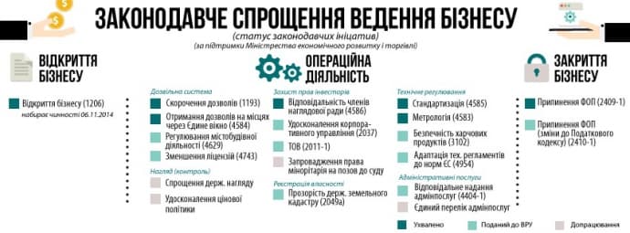Водночас подано на розгляд парламенту законопроекти щодо регулювання містобудівної діяльності, зменшення кількості ліцензій, безпеки харчових продуктів, змін до Податкового кодексу щодо закриття ФОП.