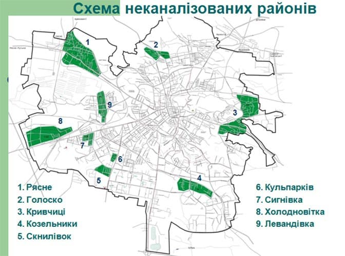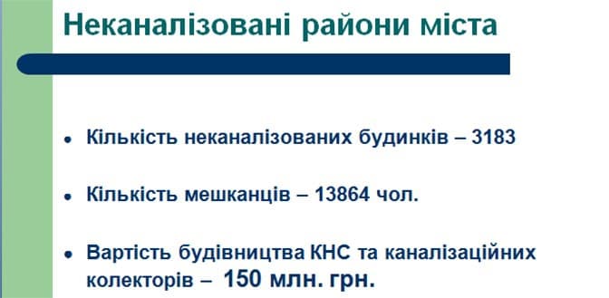 4. Низка вулиць і районів не мають каналізації. Це 9 районів – 114 вулиць, 3 183 будинки, у яких проживає 13 864 мешканців).