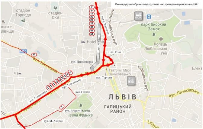 «На час проведення ремонтних робіт тролейбус №13 у напрямку до центру міста кінцеву зупинку матиме перед мостом за перехрестям просп. Чорновола – вул. Хімічної. У зворотному напрямку кінцева зупинка буде розміщена на просп.Чорновола біля палацу культури ім. Хоткевича», – сказав начальник служби диспетчеризації та організації руху ЛКП «Львівелектротранс» Ігор Фогель.