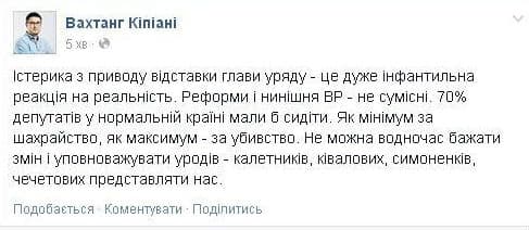 Головний редактор Інтернет-видання «Історична правда» та проекту «Владометр», викладач магістерської програми з журналістики Українського католицького університету у Львові Вахтанг Кіпіані вважає, що істерика з приводу відставки глави уряду - це дуже інфантильна реакція на реальність.