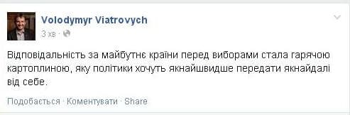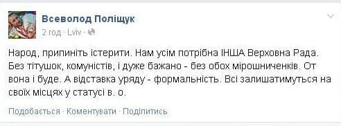 Так львів'янин, голова вченої ради Центру досліджень визвольного руху Володимир В'ятрович написав на своїй сторінці у Facebook, що сьогоднішні події у Верховній Раді продиктовані небажанням брати на себе відповідальність перед виборами.