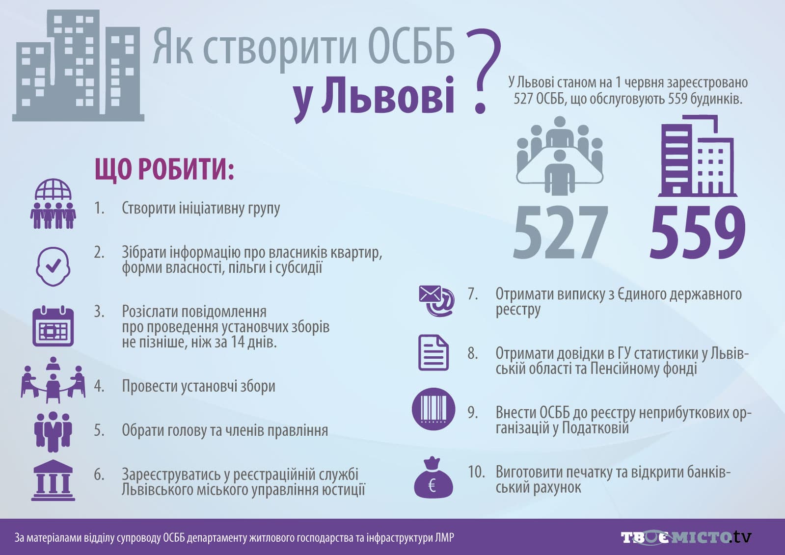 ОСББ реєструють як юридичну особу. Щоб створити ОСББ, потрібно пройти певну процедуру реєстрації. Для початку у будинку треба створити ініціативну групу, розповіла tvoemisto.tv начальник відділу супроводу ОСББ департаменту житлового господарства та інфраструктури ЛМР Галина Когут.