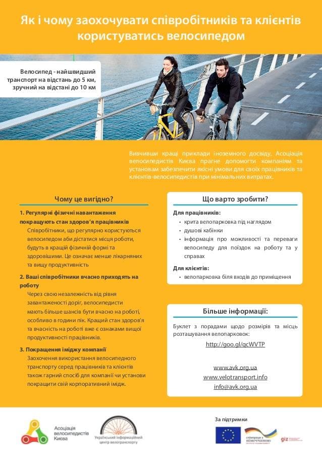 • інформація про можливості та переваги велосипеду для поїздок на роботу та у справах;