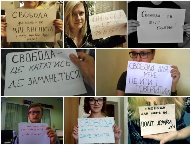 Фото-флешмоб «Свобода для мене - це ...» полягає в тому, що кожен пише на листку про своє розуміння свободи та залишає відповідне фото у групі флеш-мобу.