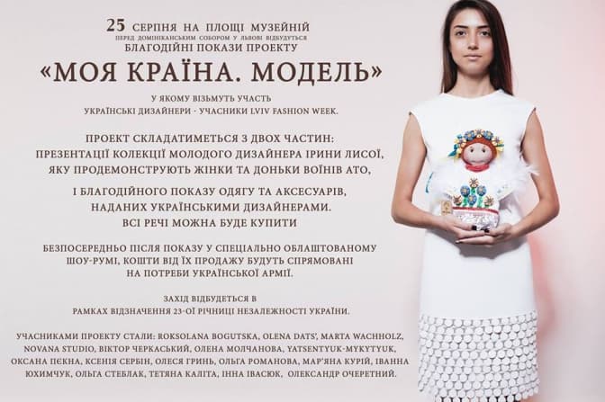 Як інформують організатори, 25 серпня, у понеділок, о 18:00 на площі Музейній (перед Домініканським собором) відбудеться благодійний показ проекту «Моя країна. Модель». Участь в проекті візьмуть українські дизайнери – учасники Lviv Fashion Week.