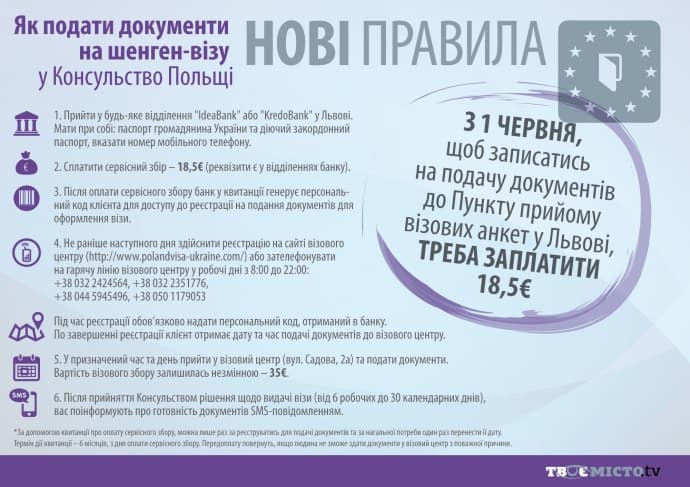 Нагадаємо, з 1 червня змінився механізм реєстрації у польському візовому центрі Львова. Відтепер, для реєстрації у центрі на отримання візи спершу треба буде здійснити в банку передоплату у сумі 18,5 євро за послуги центру. Раніше ця ж сума, так званий сервісний збір, сплачувалась при подачі документів у візовому центрі. Своє рішення у Польському Консульстві пояснили потребою боротися із нечистими на руку посередниками, які перешкоджають людям зареєструватись у візових центрах.