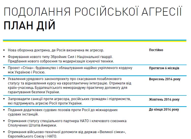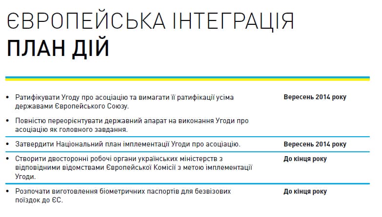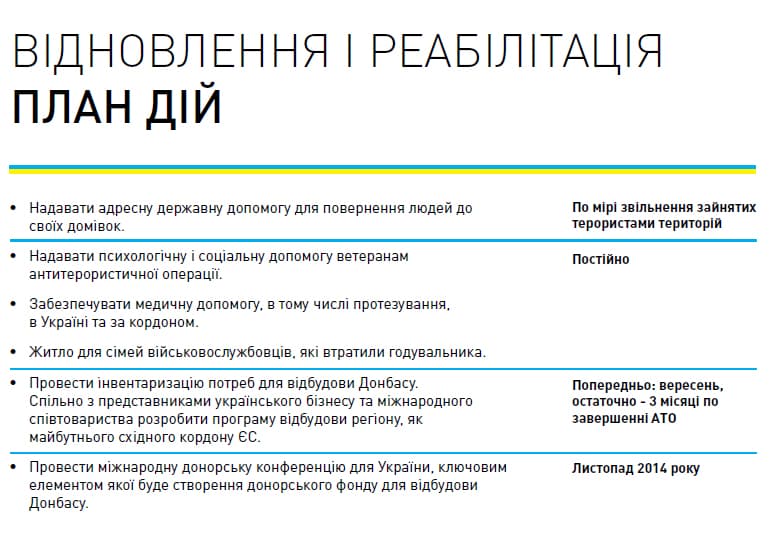 План включає багато розділів і пунктів, але ставить перед собою7основних цілей: подолання російської агресії, введення безвізового режиму між Україною та ЄС, реабілітація і допомога учасникам АТО і відновлення Донбасу, децентралізація влади, нова система оподаткування і боротьба з корупцією в країні.